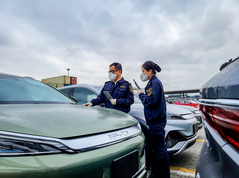 近日,黄埔海关所属新沙海关查验三科的关员们正忙着查验1700多台比亚迪、哪吒、名爵等出口汽车,该批车辆将搭乘滚装船运往目的地。